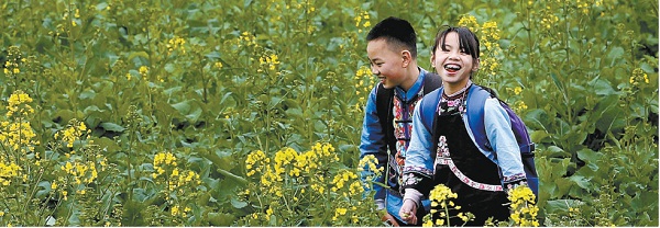 李昌颖(左)与汪政怡(右)上学路上路过一片油菜花田。