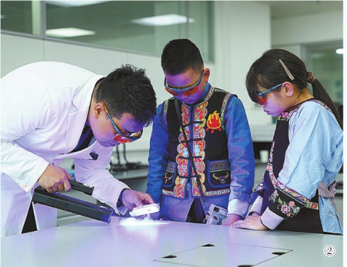 图②:最高检检察技术信息研究中心物证技术处副处长张磊向李昌颖和汪政怡介绍检察机关如何借助科技手段办理案件。李昌颖和汪政怡佩戴护目镜体验指纹识别技术。