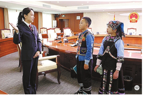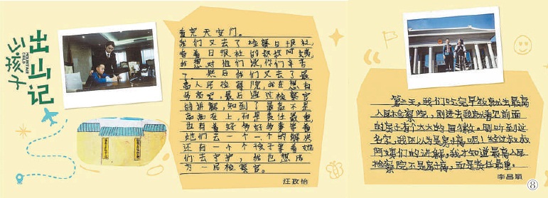 图⑧:李昌颖和汪政怡把自己的见闻记录下来,发表在“杂志”《山孩子》上。 (本版图片由张哲提供) 初春的北京,在最高人民检察院的大门前,两个来自贵州大山深处的布依族孩子仰着头,久久没有挪步。 “我想知道……最高的检察院,到底有多高呀?”10岁的汪政怡问。11岁的李昌颖努力踮起脚望向楼顶。对他们而言,这不仅是一次走出大山的机会,更是一段寻找答案的旅程。 故事要从一座桥说起。2025年9月,“世界第一高桥”贵州花江峡谷大桥通车。桥下曾经闭塞的花江村里,废弃的牛棚鸭舍被改造成乡村书屋,一群4岁到14岁的布依族孩子自己当起了主编、记者、摄影师,在老师们的帮助下创办了“杂志”《山孩子》。今年1月,贵州省贞丰县检察院检察官给编辑部带来了一堂生动的法治课。在那堂课上,这些大山里的孩子认识了“检察官”。 后来,记者将“山孩子”的故事带回北京。在最高检和检察日报社的邀请下,一个跨越2000多公里的消息飞向花江村:汪政怡和李昌颖两名“小记者”要去北京了。 走进最高检的大门,两个孩子不吭声了,站在大厅里转着圈看。“这楼比我们花江大桥矮多了。”汪政怡小声嘀咕,“不是说这是最高的检察院吗?” 在人民检察史展览陈列室,他们第一次了解人民检察事业90余年的发展历程。两个孩子听得半懂不懂,但看到泛黄的奖状和老式相机时,眼睛瞪得溜圆:“检察院到底是干啥的?” 最高检办公厅档案处干部周方园回答,如果有人侵害公共利益或未成年人,检察院就要管。“那检察的‘察’为啥是‘宝盖头’?”汪政怡接着问。周方园耐心解释:“你看,‘察’上面的宝盖头像一顶帽子,下面像一双眼睛,意思是要睁大眼睛去监督、去发现。” 在检委会会议室里,两个孩子坐在巨大的会议桌前体验表决系统。最高检检委会办公室四级高级检察官助理武雪娇告诉他们,这里是检委会委员集体讨论重大案件、作出重要决策的地方。最高检在这里审议通过的“一号检察建议”,正是为了加强未成年人司法保护。 而在检察技术信息研究中心,孩子们还第一次了解了指纹提取、物证鉴定等辅助办案的高科技手段。当屏幕上放大的指纹清晰呈现时,李昌颖下意识看了看自己的手指,立刻举起相机记录下了这些神奇的画面。 检察日报社也是孩子们北京之行的重要一站。他们第一次走进真正的新闻生产现场,从融媒体中心到影视中心,从正义会客厅到杂志编辑部,李昌颖的相机快门一直没停过。在正义会客厅,两个孩子还当了一次“小主播”:“我从贵州来,我想把家乡的故事讲给大家听。”在方圆杂志社,李昌颖翻到一篇关于渝检护“未”团队的报道。编辑告诉他,这是一个专门保护未成年人的检察官团队,做了很多保护小朋友的事,被评为“时代楷模”。“这些检察官真厉害!”李昌颖说。编辑笑着说:“你们也很厉害——你们当‘小记者’记录家乡,我们记录法治故事,做的事其实是一样的。” 回到花江村,两个孩子伏在桌前整理北京见闻,桌上摊着彩笔画下的最高检大楼,还有拍下的检徽、獬豸、检察官身影……汪政怡在笔记本上写下:“检察官阿姨说,不管我在哪里,他们都能保护我。原来最高的检察院,不是楼很高,是要保护好多好多小朋友。” 这一次,他们笔下的世界,更加辽阔。 |
